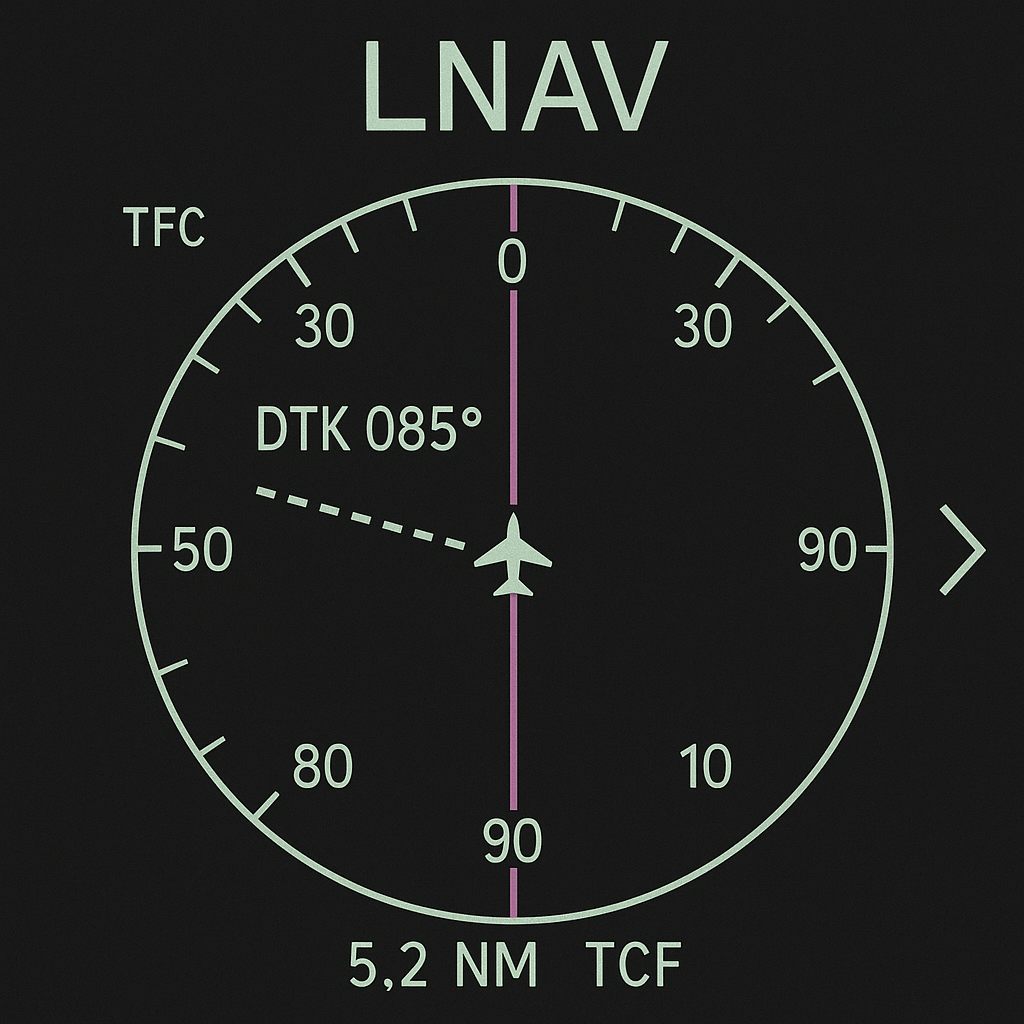 LNAV (Lateral Navigation): steuert die horizontale Flugbahn des Flugzeugs, indem es die Navigation entlang einer programmierten Route ermöglicht. Dies umfasst das Folgen von Wegpunkten und Kursen, die im Flight Management System (FMS) hinterlegt sind. Aktiviert der Pilot den LNAV-Modus, übernimmt das Autopilotsystem die Steuerung der Querruder, um das Flugzeug entlang der geplanten Route zu führen.