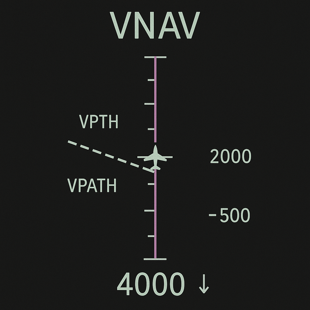 VNAV (Vertical Navigation): steuert die vertikale Flugbahn des Flugzeugs, indem es Steig- und Sinkprofile basierend auf vorgegebenen Höhenbeschränkungen und Geschwindigkeiten im Flight Management System (FMS) berechnet und einhält. Dies ermöglicht einen effizienten und sicheren Höhenwechsel während des Fluges.