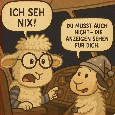 „Nachts sieht der Pilot draußen nix – aber drinnen hat er ein ganzes Schafkino voller Anzeigen. Vertrauen heißt hier: dem Navi glauben, nicht den Sternen.“